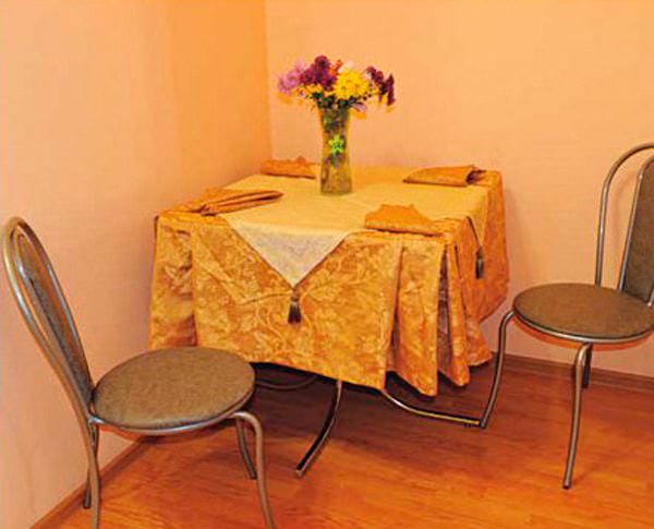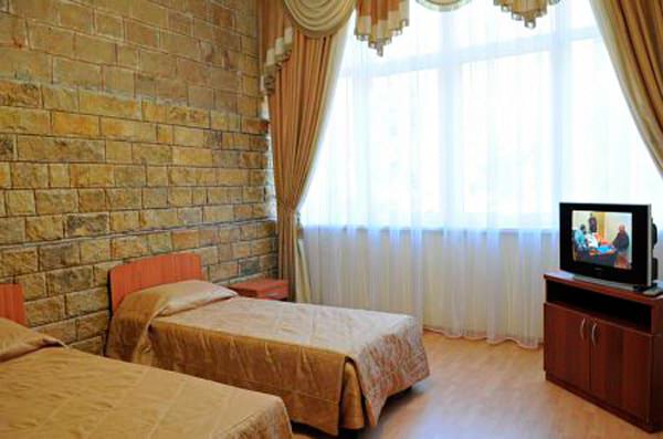Комплект мебели выполнен в приятных нейтральных цветах. Имеются две односпальные кровати, диван и кресла. Номера оснащены телевизором и холодильником.
